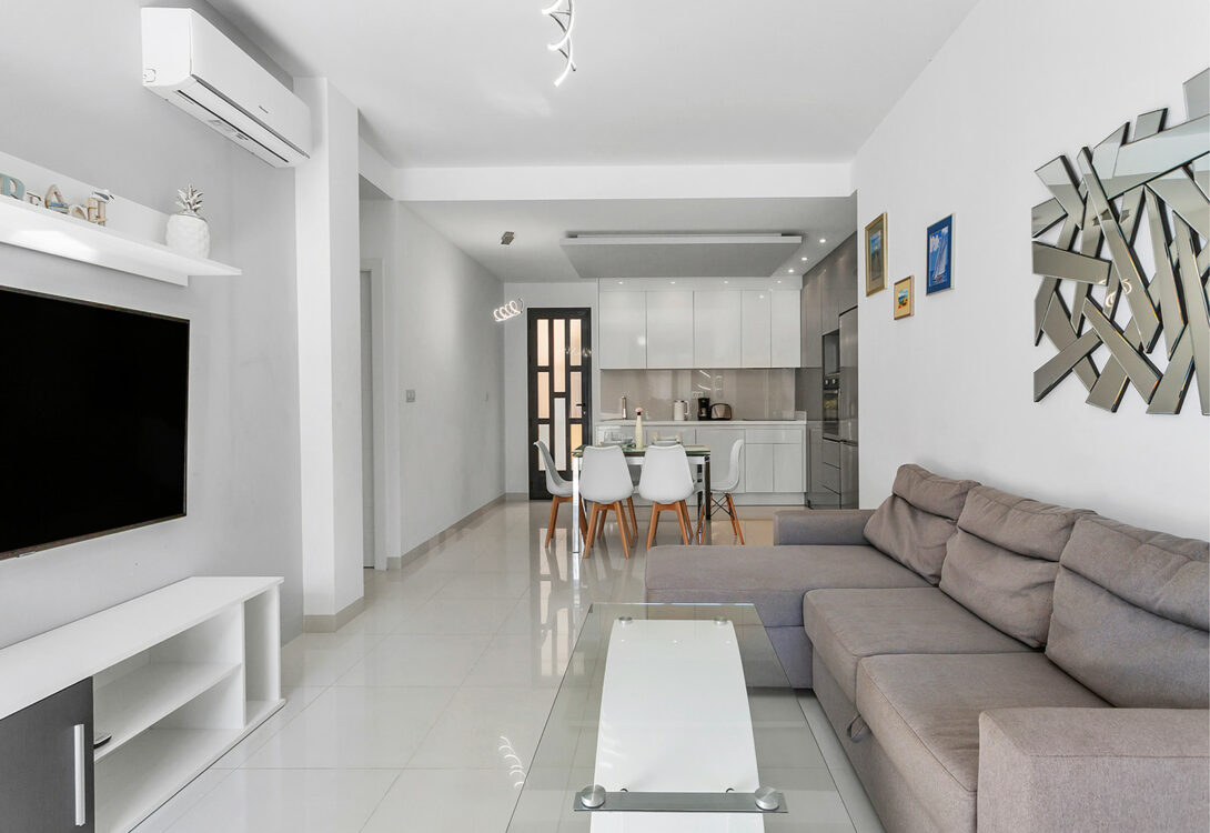 The heart of the flat is the bright living room with an open kitchen. It is fully equipped and allows you to prepare Mediterranean-style meals. The comfortable sofa in the living room offers the possibility to spend your free time watching TV. Our elegant flat is a place where luxury meets unforgettable scenery.