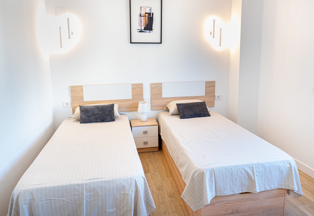 The flat is located on the 6th floor and has 2 bedrooms and 2 bathrooms. The first bedroom offers a double bed and the second bedroom two small beds.