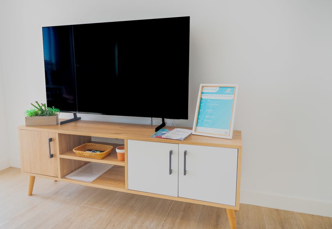 The sofa in the living room offers a choice between amazing sea views or relaxing TV viewing.